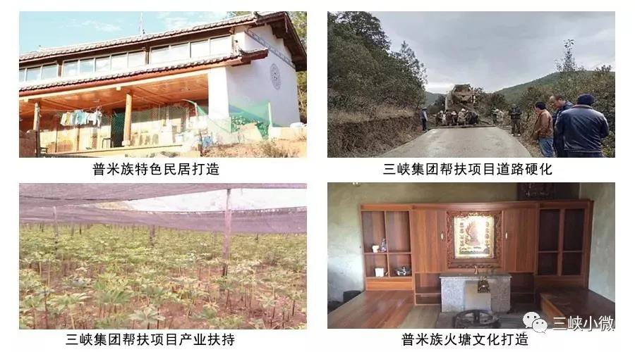 2016-2017年,三峽集團(tuán)幫扶玉龍縣石頭鄉(xiāng)利苴村,九河鄉(xiāng)金普村、河源村普米族產(chǎn)業(yè)扶持272戶,舉辦890人次的種養(yǎng)殖技術(shù)科技培訓(xùn);硬化道路50.38千米;完成特色民居建設(shè)及危房改造54戶,完成金普村大栗樹(shù)活動(dòng)中心建設(shè)、金普村通海落組活動(dòng)中心和提水站建設(shè)、普米族特色民居打造和民居改造,完成河源村河源市場(chǎng)改擴(kuò)建、普米村寨蕎地坪組橋梁建設(shè)、河源完小食堂及籃球場(chǎng)建設(shè)、河源村黨員活動(dòng)中心建設(shè)、普米村寨河源人飲設(shè)施建設(shè);新建太陽(yáng)能熱水器16戶,太陽(yáng)能路燈820盞,垃圾集中焚燒池10個(gè)。