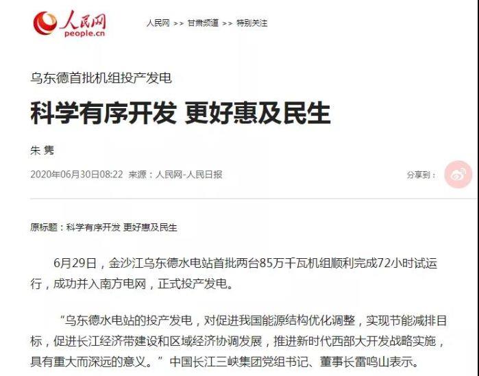 【人民網】烏東德首批機組投產發電:科學有序開發 更好惠及民生